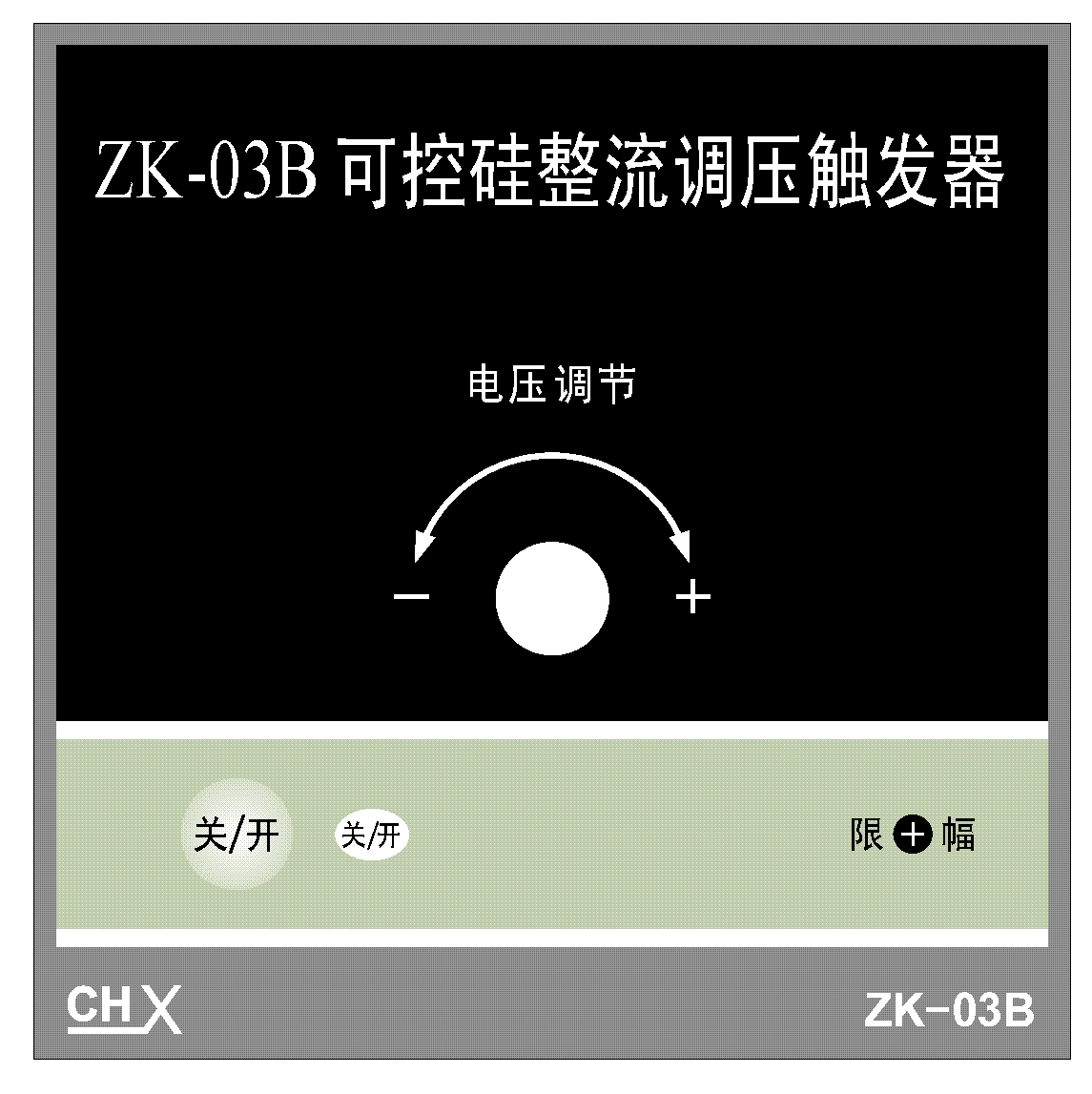ZK-03B Silicon controlled voltage-adjusting trigger adopts integrate circuit technology, control circuit adopts the connection of voltage negative feedback, its output voltage is steady, and it has strong anti-interference ability and reliable quality. On the instrument face-plate, the knob of Output Setting manual adjustment output voltage has been set and it has the amplitude limit function to meet the need of the customer to the control system.