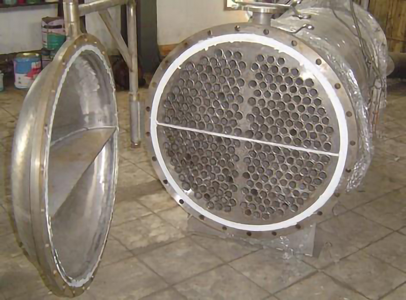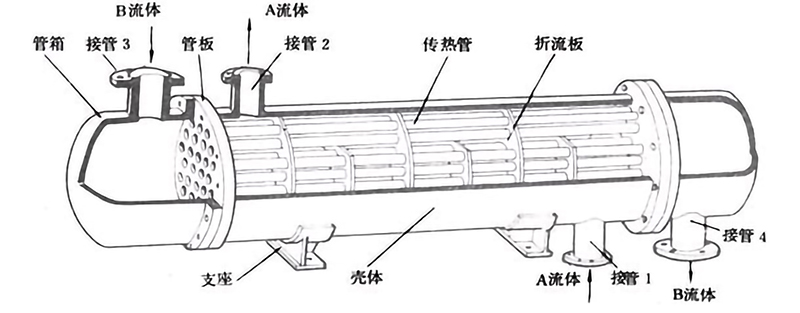 列管式换热器的结构比较简单、紧凑、造价便宜。此种换热器管束连接在管板上,管板分别焊在外壳两端,并在其上连接有顶盖,顶盖和壳体装有流体进出口接管。通常在管外装置一系列垂直于管束的挡板。同时管子和管板与外壳的连接都是刚性的,而管内管外是两种不同温度的流体。